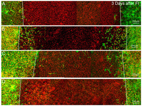 Maximum intensity projection images (~50 microns thick) of f-actin (green) and TOTO-3 (red), 4 days after freeze injury (FI) in standard compressed matrices and culture in (A) basal media; (B) 10% FBS; (C) TGFβ1 or (D) PDGF. Migrating cells are observed in the wounded area under 10% FBS and TGFβ1 conditions. However, most of these cells are on or near the surface of the construct. Few migrating cells are observed under serum-free or PDGF culture conditions.