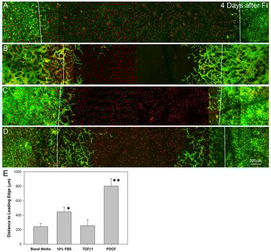 Maximum intensity projection images of f-actin (green) and toto (red), 4 days after freeze injury (FI) on sandwiched matrix constructs, and culture in basal media (A); 10% FBS (B); TGFβ (C) or PDGF BB (D); Migrating cells are observed in the wounded area under PDGF (D) and 10% FBS (B) conditions. Few migrating cells are observed under serum-free (A) or TGFβ1 (C) culture conditions. E. Quantitative analysis of the distance cells traveled into the injury. Traveling the farthest were cells in PDGF (** P < 0.001 as compared to the other three conditions) and 10% FBS (* P < 0.01 as compared to basal media and TGFβ1).