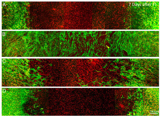 One to seven days after injury, constructs were fixed using 3% paraformaldehyde in phosphate buffer for 10 min and permeabilized with 0.5% Triton X-100 in phosphate buffer for 3 min. Cells were labeled with Alexa Fluor 488 Phalloidin (1:50; Molecular Probes, Eugene, OR, USA) for 1 h and then washed in phosphate buffer saline (PBS; 3 times for 5 min). To stain the cell nuclei, TOTO-3 iodide (1:200; Molecular Probes, Eugene, OR, USA) was then added to each sample for 15 min, and samples were washed a final time with PBS.