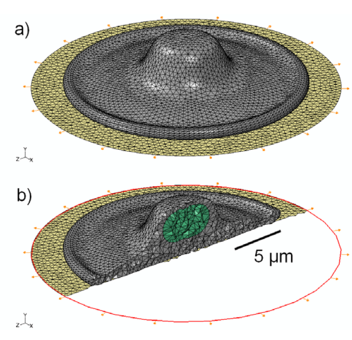 The cell geometry used in this study is representative of an adherent osteoblastic cell as it would be configured in vitro on a flat substrate. The shape (illustrated in Figure 1) is a rotationally symmetric flattened shell, with characteristic diameter of 20 µm and maximum height of 5 µm. The thinnest section of the “foot” (i.e., the flattened part of the plated cytoplasm) is 1 µm thick and total cell volume is 490 µm3. The nucleus is modeled as an ellipsoid, with maximum diameter of 5 µm, minimum diameter of 2 µm and volume of 46 µm3. These dimensions are representative of osteoblastic cells observed with confocal microscopy, and are consistent with similar finite-element models reported previously [57,58,73,74].