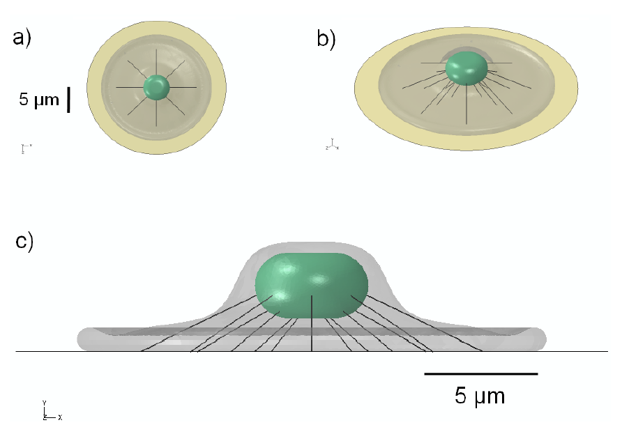 The three-dimensional geometry of the simple cell model is shown in Figure 1; the shape that we have employed is similar to the “fried-egg” model of an attached cell in vitro [85]. As shown in the schematic, the tension on the underlying substrate is applied radially to produce an isotropic strain field under the attached cell. The cross-sectional image illustrates the location of the nucleus within the cytoplasm. The addition of stress fibers (Figure 2) mimics the configuration proposed in [82].