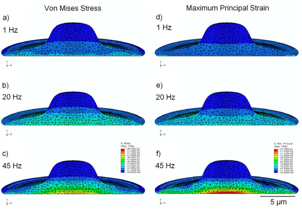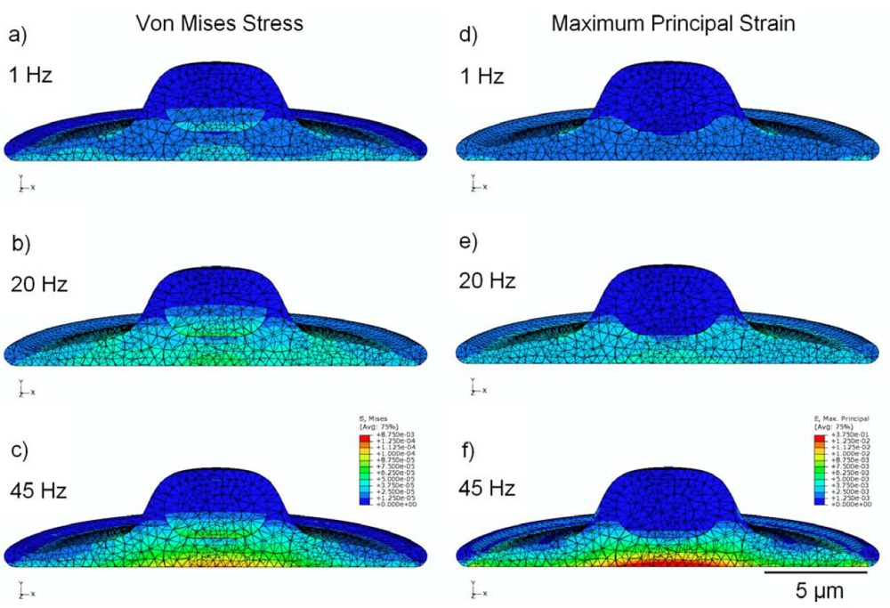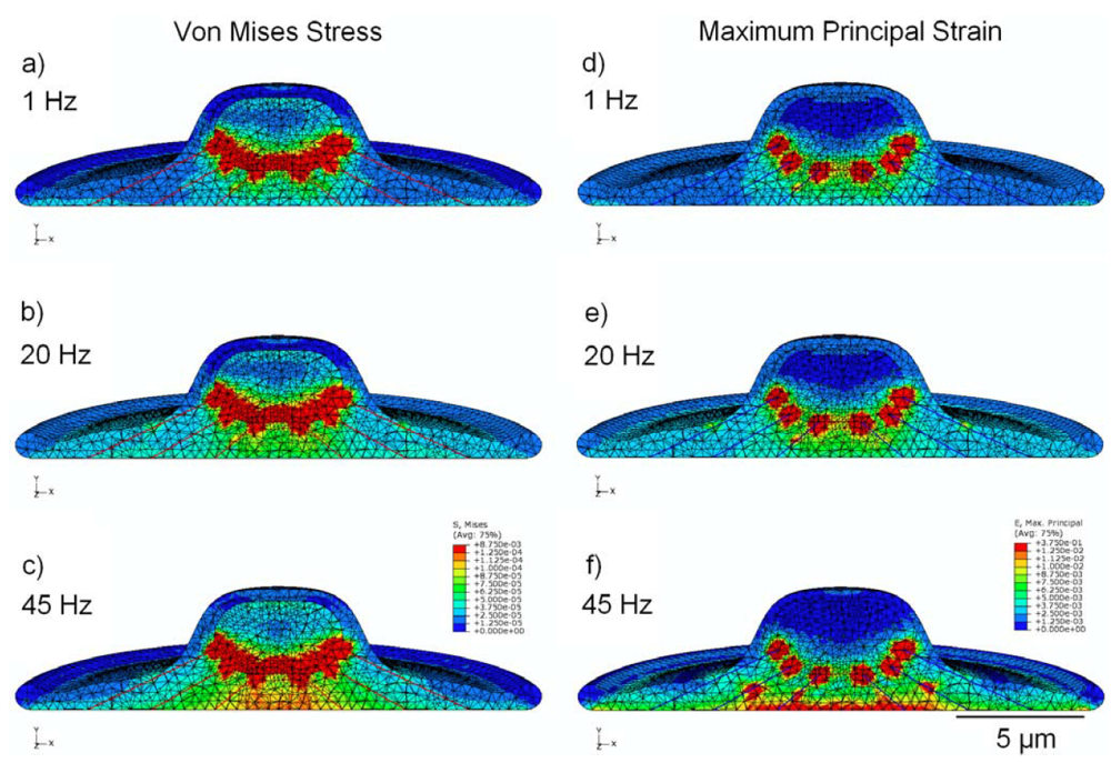 finite-element modeling (FEM) simulation results, showing peak values of stress in MPa (a,b,c) and strain (d,e,f) over the stimulation cycle, for frequencies of 1 Hz, 20 Hz, and 45 Hz. Cytoplasm is assumed to be viscoelastic, with the elastic modulus of the nucleus four times stiffer.