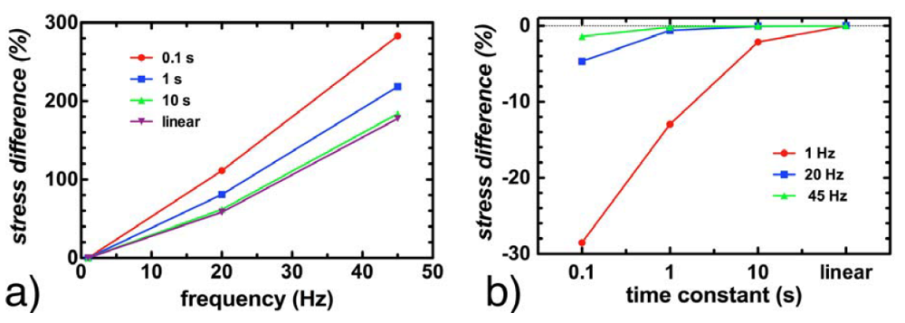 The impact of the assumed viscoelastic relaxation time constant τ at various frequencies. (a) shows the percentage increase in maximum cytoplasmic stress as a function of frequency, for τ = 0.1, 1 and 10 s, as well as for a linear elastic material; (b) shows the decrease in observed maximum cytoplasmic stress at 1, 20 and 45 Hz as a function of viscoelastic time constant, where the difference is with respect to a linear elastic model.