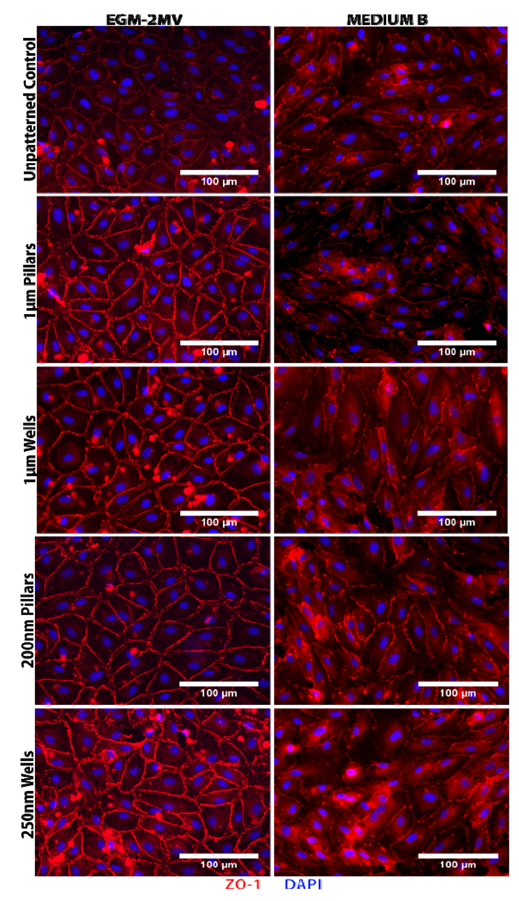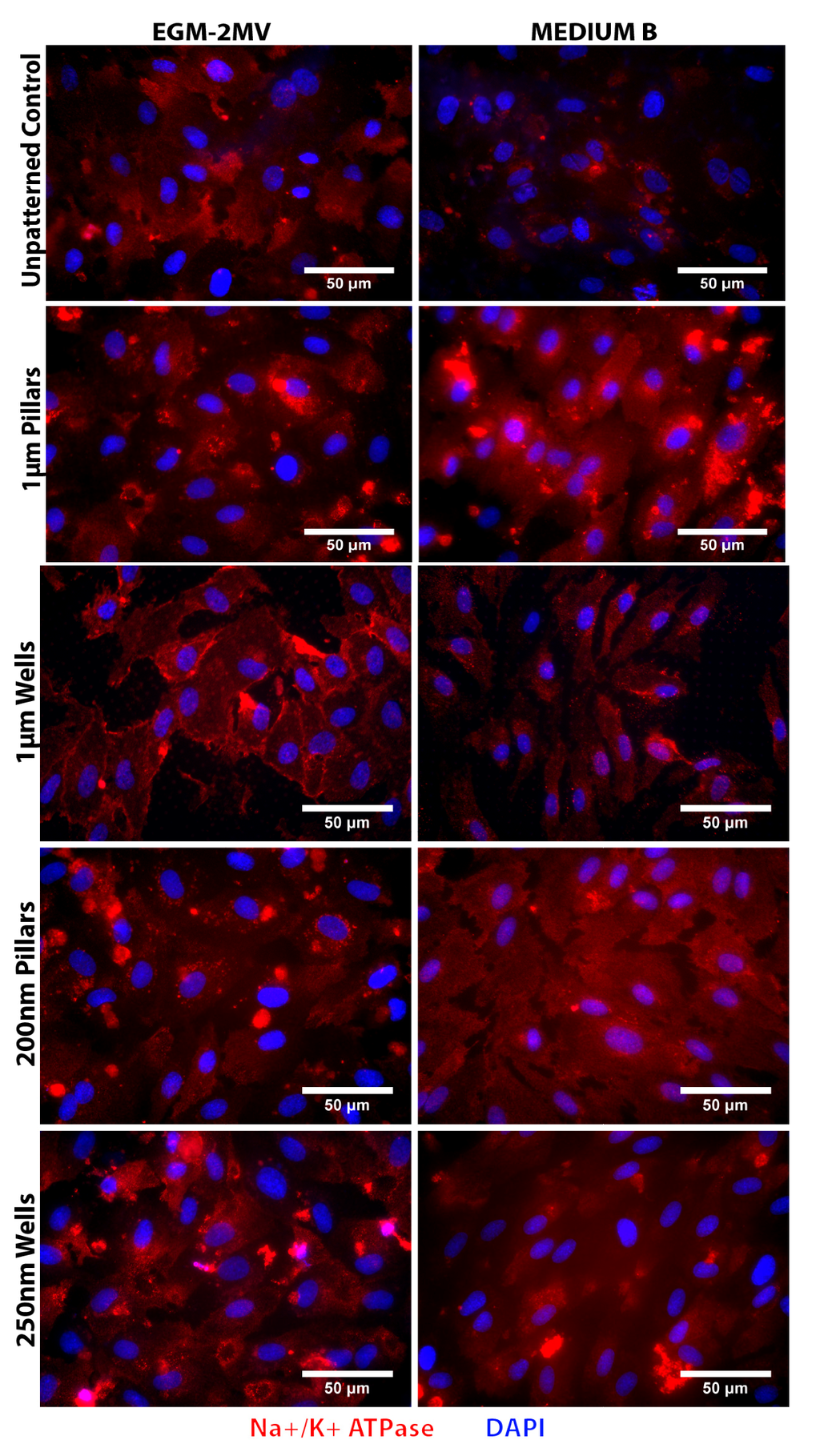 | Topography | Medium | Cell area | Cell circularity | HSF | CV | ZO-1 | Na+/K+ ATPase | SEM | Scoring |