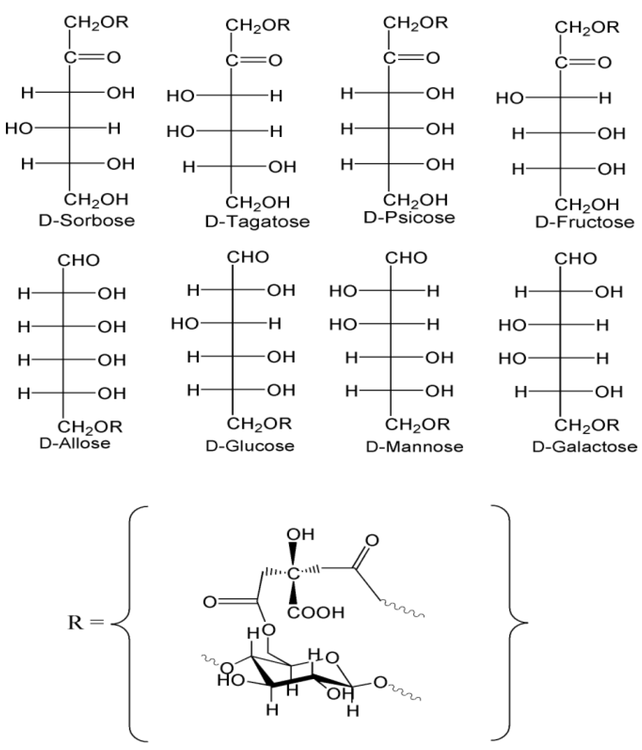 Structures for two pairs of aldohexose and ketohexose enantiomeric isomers conjugated to cellulose. The open chain reducing sugar is illustrated as the free aldehyde and ketone in equilibrium with the hemiacetal and hemiketal respectively. Below is the R group structure of one possible form of the substituted citrate-cellulose conjugate.