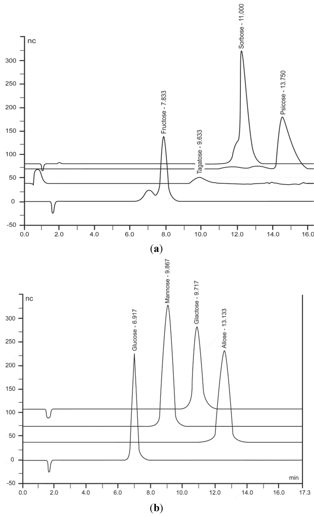 (a) HPLC chromatograms of ketohexoses released from cellulose conjugate; (b) HPLC chromatograms of aldohexoses released from cellulose conjugate.