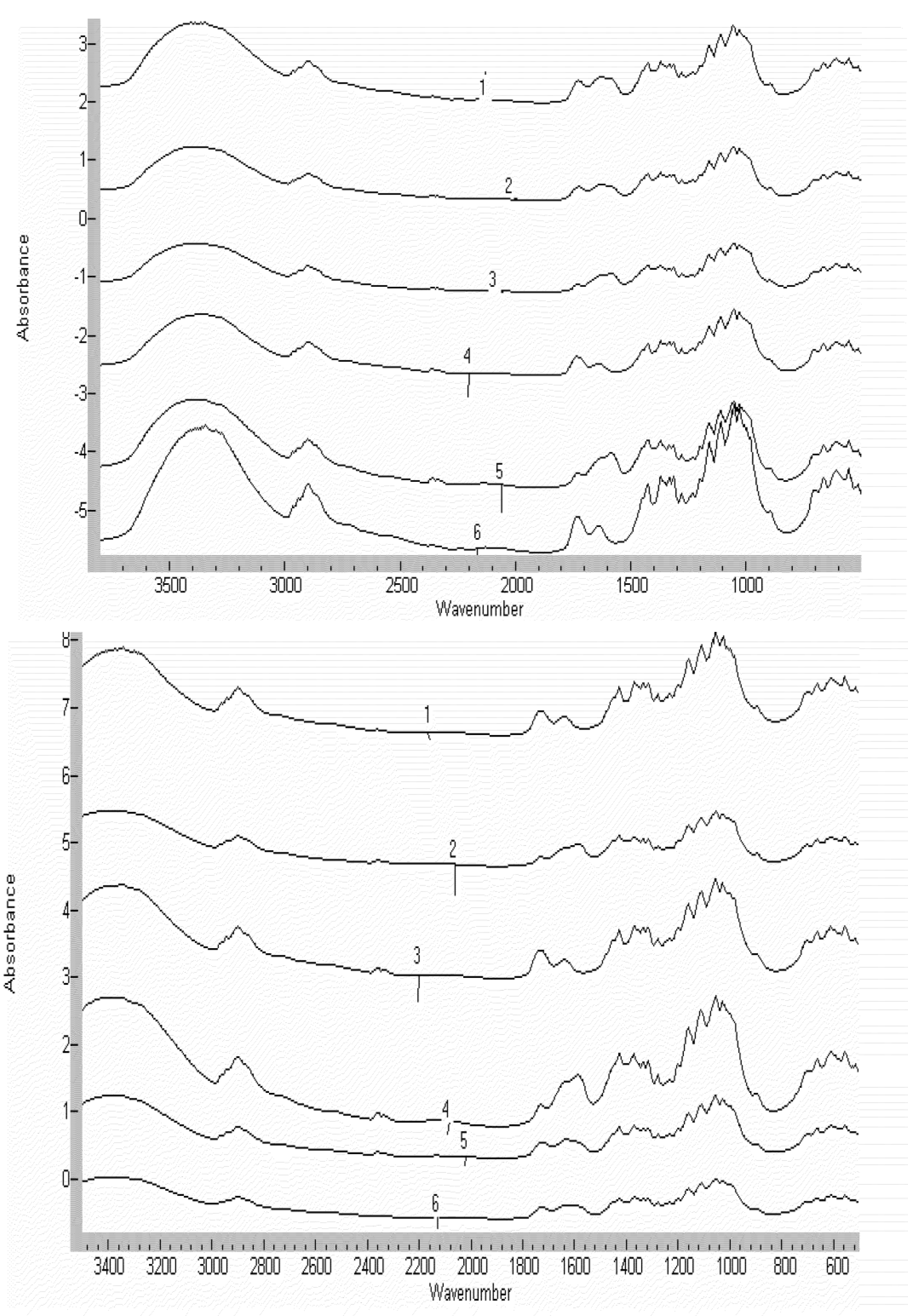 (a) FTIR spectra of representative ketohexose-citrate-crosslinked-cellulose cotton gauze: Fourier transform infrared spectra of crosslinked monosaccharide conjugates. (1) Spectrum of allose-cellulose crosslinked conjugate treated with 0.1 M HCl; (2) Spectrum of mannose-cellulose crosslinked conjugate treated with 0.1 M HCl; (3) Spectrum of allose-cellulose crosslinked conjugate treated with 0.1 M NaOH; (4) Spectrum of annose-cellulose crosslinked conjugate treated with 0.1 M NaOH; (5) Spectrum of allose-cellulose crosslinked conjugate; (6) Spectrum of mannose-cellulose crosslinked conjugate; (b) FTIR spectra of representative alohexose-citrate-crosslinked-cellulose cotton gauze. Fourier transform infrared spectra of crosslinked monosaccharide conjugates. (1) Spectrum of sorbose-cellulose crosslinked conjugate; (2) Spectrum of sorbose-cellulose crosslinked conjugate treated with 0.1 M HCl; (3) Spectrum of sorbose-cellulose crosslinked conjugate treated with 0.1 M NaOH; (4) Spectrum of tagatose-cellulose crosslinked conjugate; (5) Spectrum of tagatose-cellulose crosslinked conjugate treated with 0.1 M HCl; (6) Spectrum of tagatose-cellulose crosslinked conjugate treated with 0.1 M NaOH.