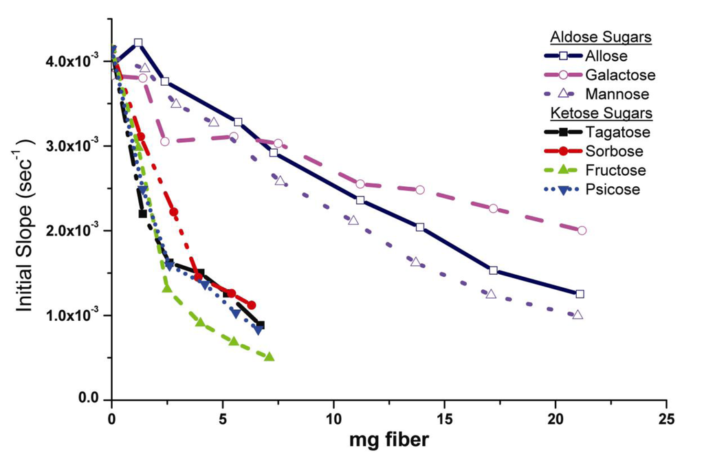 Sequestration binding of Human Neutrophil Elastase by Monosaccharide-Cellulose Conjuates on Cotton Gauze. Dose response curves plotted for both families of monosaccharides. Kinetic rate constants were obtained from reaction progress curves for each monosaccharide conjugate by assaying the conjugates of cellulose on cotton as described in the Materials and Methods section. The initial slope of each conjugate assay was plotted versus the weight of the cotton fiber used in the elastase uptake assay.