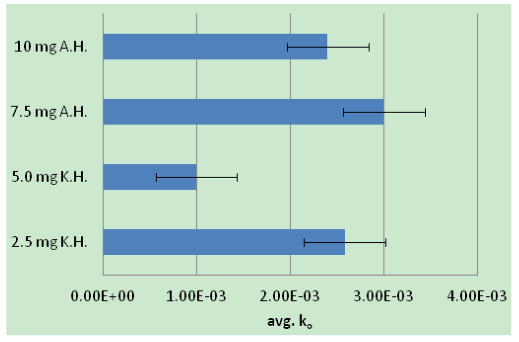 A bar graph comparing the initial rate constants (ko sec−1)for keto- and aldohexose cellulose conjugates. A lower rate constant corresponds to higher elastase sequestration by the dressing. Initial rates are an average of three runs at each weight shown with standard deviations. A.H. = aldohexose, K.H. = ketohexose. Hence the lower rate at 5 and 2.5 mgs of the ketohexose conjugates reflect higher elastase sequestration.
