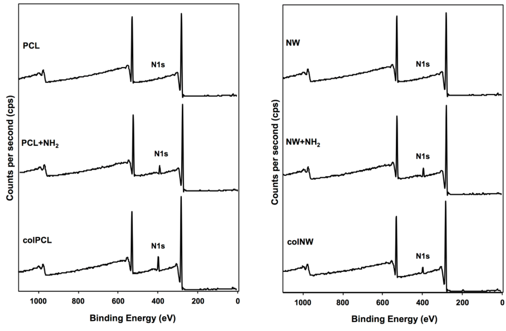 Survey XPS scans of PCL, NW, colPCL and colNW surfaces. Results show an increase in the N1s peak throughout the collagen immobilization process.