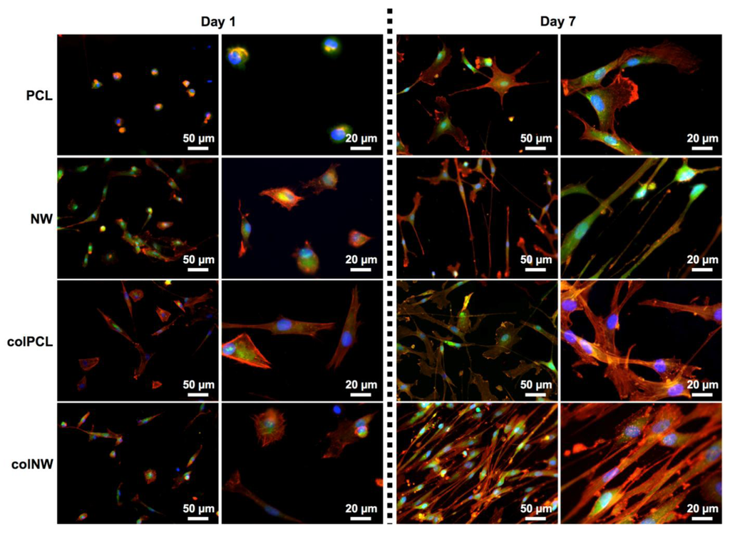 SMC adhesion and proliferation was evaluated after one and seven days of culture by using 5-chloromethylfluorescein diacetate (CMFDA) live stain (Invitrogen, Carlsbad, NM, USA), rhodamine phalloidin (Cytoskeleton) and 4',6-diamidino-2-phenylindole dihydrochloride (DAPI) (Invitrogen) nucleus stain, followed by imaging with a fluorescence microscope (Figure 4). At Day 1, it is evident that cells adhered onto the NW, colPCL and colNW surfaces have an elongated phenotype compared to PCL surfaces. SMCs on NW, colPCL and colNW also exhibit multiple cellular extensions interacting with the surfaces, as well as with surrounding cells. After seven days of culture, there are more cells covering and interacting on both the colPCL and colNW surfaces, as compared to the PCL and NW surfaces. It is important to note that the cells on the nanostructured surfaces (NW and colNW) seem to be aligning and more spindle-shaped compared to the flat surfaces (PCL and colPCL).