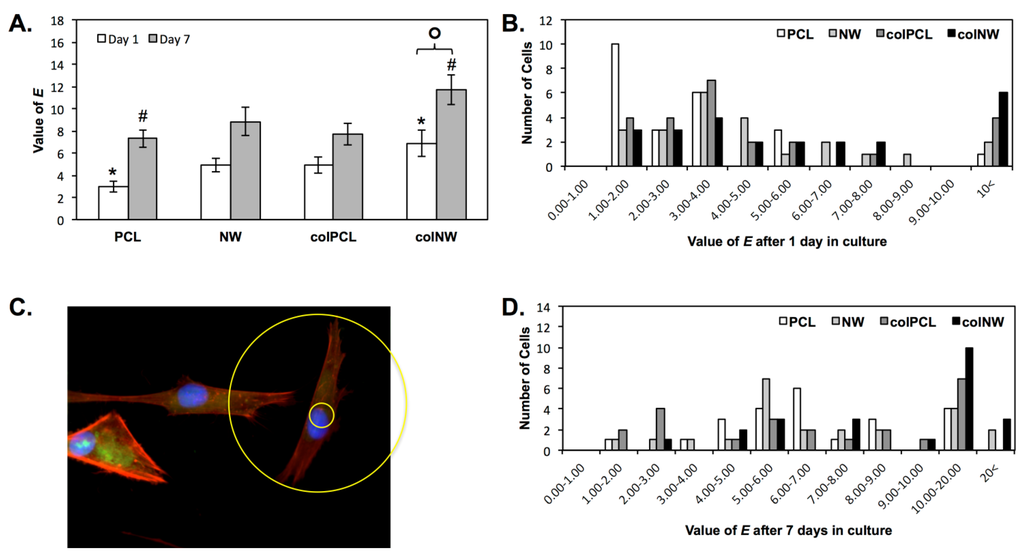 (A) Elongation (E) approximations of cells on different surfaces after one and seven days of culture. Experiments were replicated on at least three different samples with at least three different cell populations (nmin = 9). Statistical significance was calculated using a one-way ANOVA with Tukey’s post hoc test. Results indicate that colNW surfaces exhibit a more elongated morphology after one and seven days of culture compared to PCL surfaces at the same time points (*, #, p < 0.05). SMCs also become significantly more elongated on colNW surfaces after seven days of culture compared to those in culture for one day on colNW surfaces (¢, p < 0.05). Error bars represent the standard error; (B) The image shows how E approximations were calculated (outer diameter/inner diameter); A histogram of E approximations of cells on different surfaces after (C) one day in culture and (D) seven days in culture.
