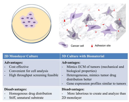 The study of human cancer biology, as well as the development and testing of anti-cancer drugs, typically begins with in vitro culture of cancer cells in Petri dishes. Two-dimensional monolayer cell cultures were used in early efforts to understand the interactions between cancer cells and tumor stromal cells and how these interactions influenced the disease process. However, these 2D systems have poor resemblance to the 3D in vivo tumor environment and often have little value in predicting the clinical efficacy of therapies []. For example, cancer cells in 2D demonstrate uniform growth, with most cells at the same cell cycle stage, unlike cancer cells in vivo, which are at different stages of the cell cycle. They also do not capture the phenotypic heterogeneity in terms of gene expression and differentiation in tumors [,]. To overcome some of these shortfalls, 3D culture systems have been employed, in which cancer cells lose polarity and form cell aggregates, thereby accounting for the tumor architecture that is absent in 2D cultures (Figure 1) [,,]. These characteristics make 3D models physiologically relevant systems for the study of tumor dynamics and response to therapies [,].