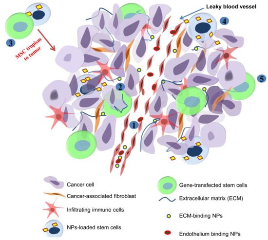 In addition to targeting therapeutics to tumors, most drug delivery systems provide stability, controlled release within the therapeutic window of drugs/biologics and decrease toxicity []. In addition to drug delivery systems, the tropism of MSCs to tumors is being leveraged to modulate the stroma and for drug delivery (Figure 2).