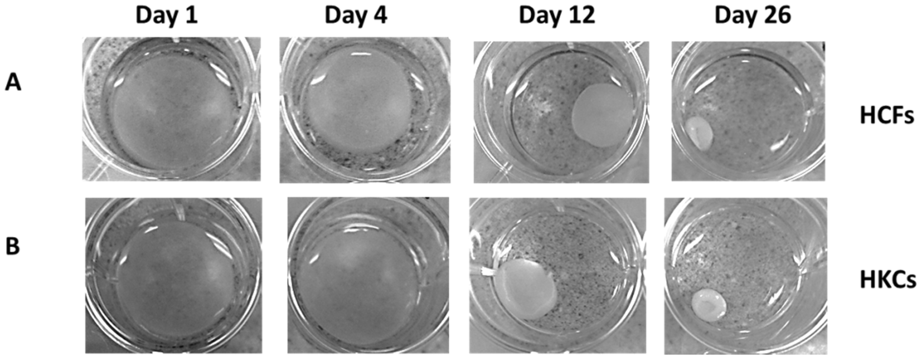 Floating 3D-collagen gel seeded with untreated control (A) human corneal fibroblasts (HCFs) and (B) human keratoconus cells (HKCs). Change in area of the collagen gel was measured every other day using ImageJ software. Representative images shown, n = 3.