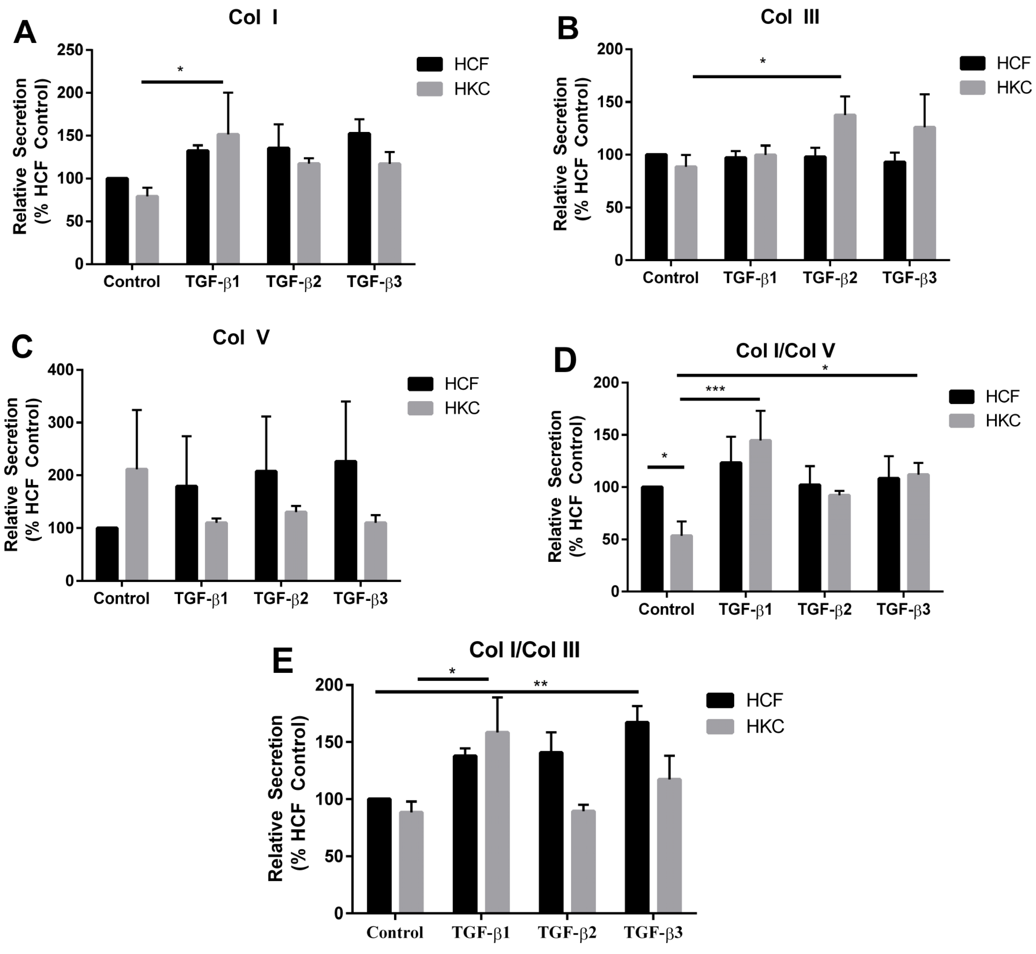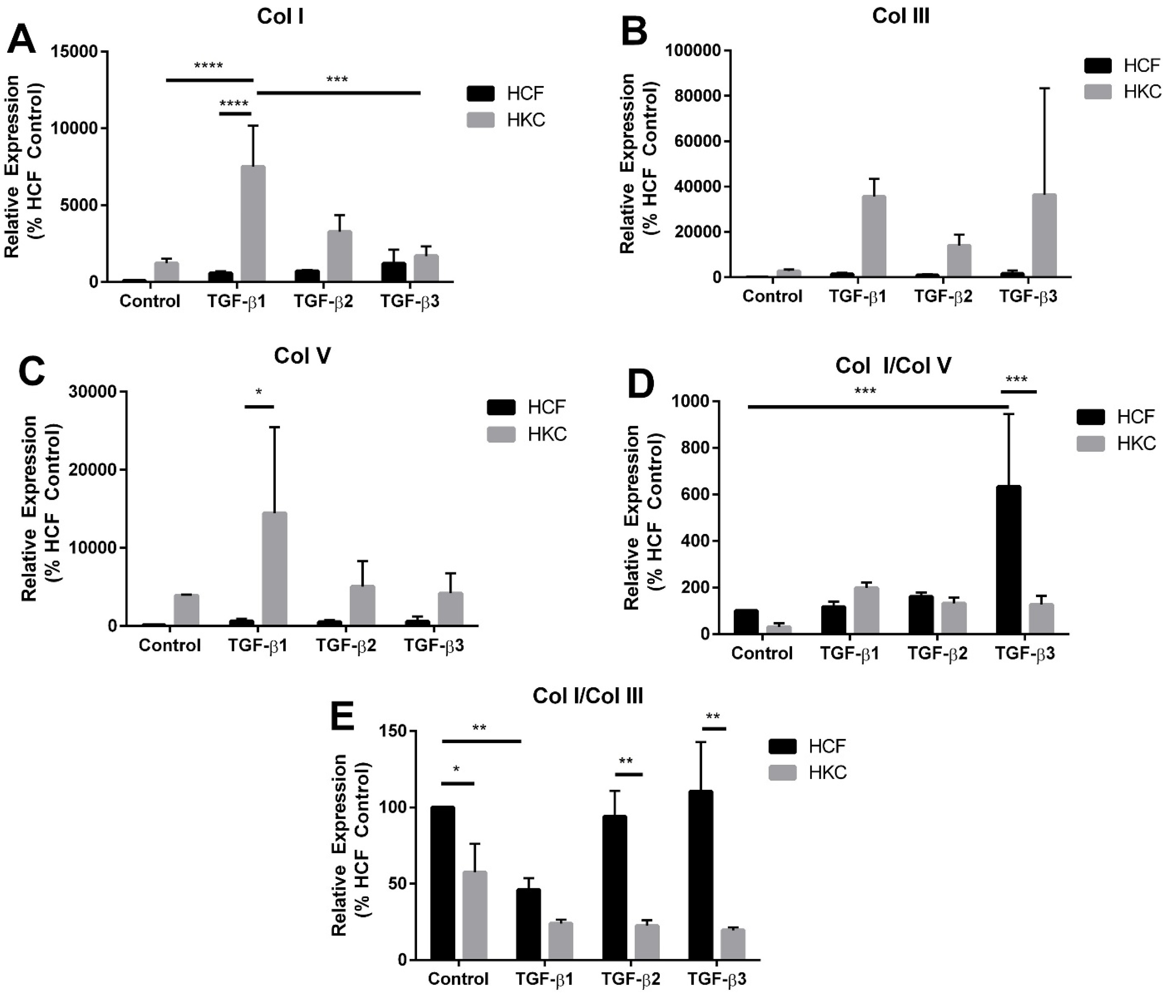 (A) Collagen I (Col I), (B) Collagen III (Col III), and (C) Collagen V (Col V) expression and (D–E) ratios of Col I/Col V and Col I/Col III by HCFs and HKCs at week 4 measured by RT-PCR. n = 3, error bars represent standard error of the mean. (**** denotes p < 0.0001, *** denotes p < 0.001, ** denotes p < 0.01 and * denotes p < 0.05.)