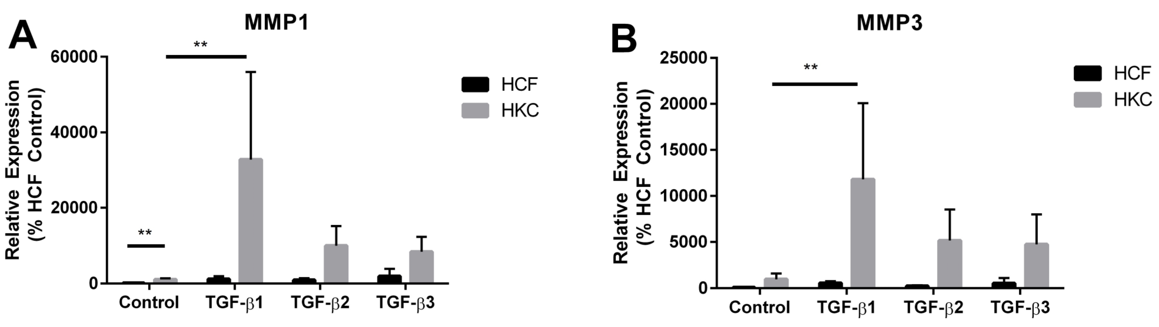 MMPs are important in ECM degradation and remodeling within tissues [58]. Increased MMP activity has been posited to play a role in KC disease progression [59,60]. Previous studies have linked upregulation of MMP1 in KC corneal buttons suggesting that degradation of the resident stromal collagen may contribute to KC pathogenesis [61,62]. Furthermore, MMP1 gene expression is transcriptionally regulated with MMP3 gene expression [63], which has yet to be linked to KC. Since KC is associated with thinning of the corneal stroma, we measured expression of MMP1 and MMP3, which are important mediators of ECM degradation in tissues [58]. Interestingly, we measured a 10-fold increase of MMP1 expression in HKCs compared to HCFs (Figure 5A, p < 0.01). There was no significant difference in basal expression of MMP3 between HCFs and HKCs (Figure 5B). We found a significant increase in MMP1 expression by over 10-fold with TGF-β1 treatment in both HCFs and HKCs (Figure 5A, p < 0.01). TGF-β2 and TGF-β3 increased MMP1 expression by 9-fold and 19-fold, respectively, in HCFs compared to a 2.4-fold and 5.3-fold increase in HKCs (Figure 5A). MMP3 expression also increased in both cell types with TGF-β1, -2, and -3 isoform treatment with a 5.5-fold, 2.4-fold, 5.3-fold, respectively, in HCFs and 8-fold, 4.4-fold, 5.9-fold, respectively, increase in HKCs (Figure 5B).