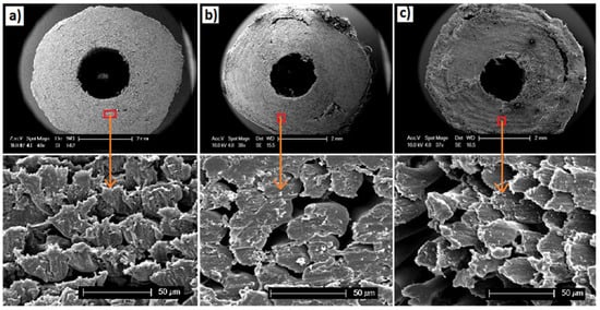 SEM images showing lateral cross sections of polylactic acid (PLA) fibre reinforced tubular scaffolds: (a) PLA-polyvinyl acetate (PVAc); (b) PLA-15% β-tricalcium phosphate (β-TCP); and (c) PLA-30% β-TCP. The SEM images at the bottom of each tubular scaffold reveal the void/porosity within each scaffold.