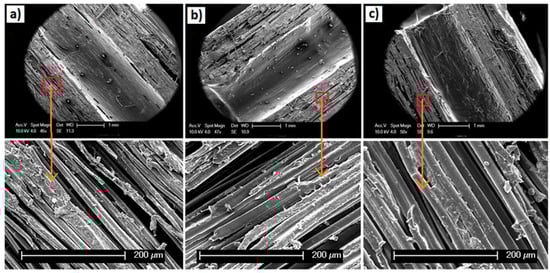 SEM images presented in Figure 1a–c revealed the lateral cross sectional morphology of the PLA fibre reinforced tubular scaffolds containing various ratios of PVAc/β-TCP blends. From Figure 1a, it can be seen that the PLA-PVAc tubular scaffold exhibited a more consolidated structure with smaller voids as compared to the other two (Figure 1b,c) PLA-PVAc/β-TCP blended scaffolds.