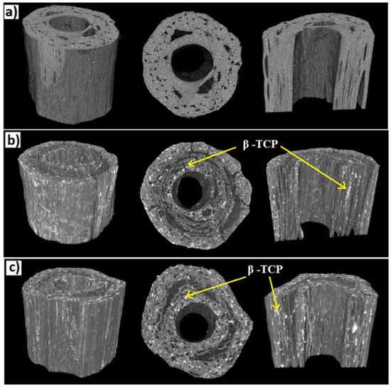 3D projections of tubular scaffolds showing the lateral cross sections and internal architectures: (a) PLA-PVAc; (b) PLA-15% β-TCP, and (c) PLA-30% β-TCP.