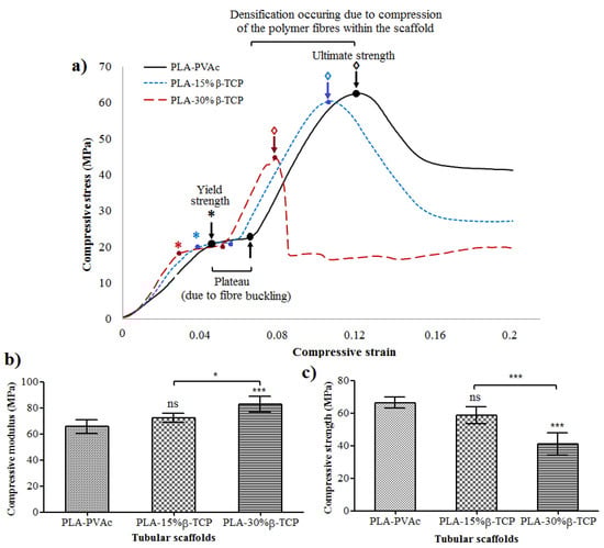 The compressive stress-strain curve presented in Figure 4a shows the compressive properties of the tubular scaffolds produced, where the control PLA-PVAc tubular scaffold revealed a ductile profile from the compression tests. The properties of the tubular scaffolds exhibited lower compressive strength with increasing β-TCP content within the scaffolds. Compressive strength for PLA-PVAc scaffolds decreased from 67 MPa to 59 and 41 MPa by inclusion of 15% and 30% of β-TCP respectively. Moreover, it was noted that the steepness of the curves increased with the amount of β-TCP content during the initial stage of the compressive strain.