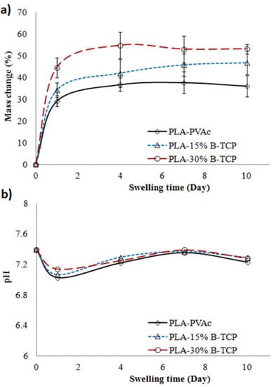 The mass gains observed for the scaffolds immersed in PBS media were seen to increase dramatically over 24 h. For example, PLA-PVAc tubes gained approximately 29% mass after 24 h of immersion in PBS, whereas the PLA-30%β-TCP scaffolds revealed a 45% mass gain at the same time point. This suggested that the PBS media disrupted the physical cross-linking through weakening of inter and intra-molecular hydrogen bonds within the PVAc molecules [46,47]. Xinghai et al. [48] reported that water absorption capacity of pure PVAc was around 32.5% after immersion for 24 h at room temperature. In addition, the higher mass gain observed for the PVAc/β-TCP scaffolds was expected due to the presence of the voids observed above (confirmed via SEM and µCT analyses). The pH for the scaffolds immersed in PBS was seen to remain relatively neutral (i.e., in the region of 7.1 to 7.4) over a 10 day period. A slight decrease in pH during the early day of swelling period (i.e., day 1) could be attributed to be due to the release of some unbound or loosely bound PVAc and β-TCP molecules into the PBS media.
