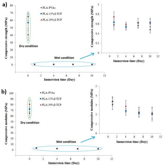 (a) Compressive strength; and (b) modulus properties of tubular scaffolds obtained after immersion in PBS media at 37 °C over the period of 10 days.