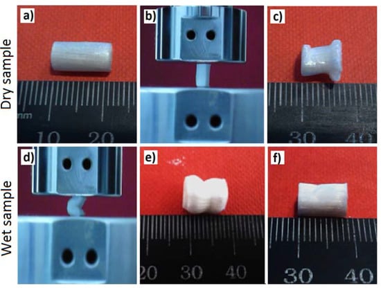 Images represent the shape recovery behaviour of the tubular scaffolds: (a) PLA-30% β-TCP tubular scaffolds (dry state); (b) setup for the compression test; (c) compressed PLA-30% β-TCP tubular scaffolds (dry state) showing their permanent set (image taken after three days of compression test); (d) compression of the wet PLA-30% β-TCP tubular scaffolds; (e,f) compressed PLA-30% β-TCP tubular scaffolds after immersion in PBS for 7 days (images were taken after (e) 30 s and (f) 5 min after compression testing).