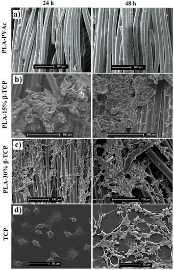Influence of PVAc/β-TCP coating materials and fibrous structure on cultured MG-63 osteosarcoma cells morphology and spreading at varying time points (24 and 48 h): (a) control PLA-PVAc; (b) PLA 15% β-TCP; (c) PLA 30% β-TCP, and (d) control tissue culture plastic.