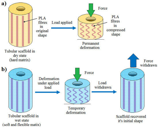 Schemes representing the tubular scaffolds undergo (a) a permanent deformation in dry state and (b) shape recovery behaviour of wet sample.