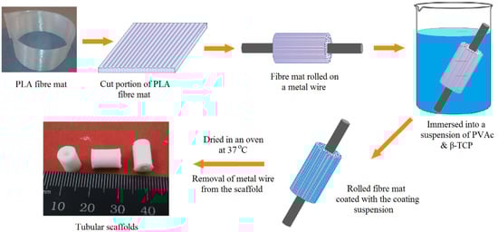 Aligned PLA fibre mats (consisting of 10 layers of PLA fibres) were produced and the coating materials (highlighted in Table 2) were applied using a syringe needle followed by gently brushing to disperse the coating materials [41]. Fibre mats (with an average thickness of 0.4 mm containing around 1.2 wt % of coating materials) were prepared and removed from the drum after drying at room temperature for 16 h. These PLA fibre mats (40 mm × 80 mm dimension) were then wrapped manually around a metal wire (diameter 2.38 mm) and then dipped into the coating blends for 30 min before being dried at 37 °C for 48 h to produce tubular scaffolds as presented in Figure 10.