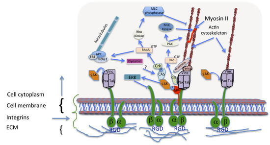 ECM-cell interaction is mediated through transmembrane proteins called integrins [131]. Integrins bind to proteins in the ECM through complex mechanism (Figure 2) involving the formation of attachment points between the cell membrane and a surface resulting in tension formation within the cell and at the same time transmitting information from the ECM inside the cell. This transmission of information is mediated through the binding of a number of integrin-binding molecules, as RhoA kinase and focal adhesion kinase (FAK). These kinases can regulate multiple cellular processes such as proliferation and differentiation through the activation of a series of intracellular signaling pathways including extracellular signal-regulated kinase/mitogen-activated protein kinase (ERK/MAPK) [132,133].
