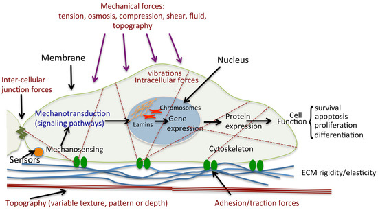 MSCs and differentiated cells have their own unique physical properties such as stiffness (Table 1). However, the cells within the tissues are embedded inside a very complex fibrous extracellular matrix (ECM). The physical and mechanical properties of the ECM are essential for tissue homeostasis, through regulating cellular functions such as attachment, spreading, migration, stem cell differentiation and proliferation [81,82]. The ECM has been implicated in the pathogenesis of cancer [83,84,85].