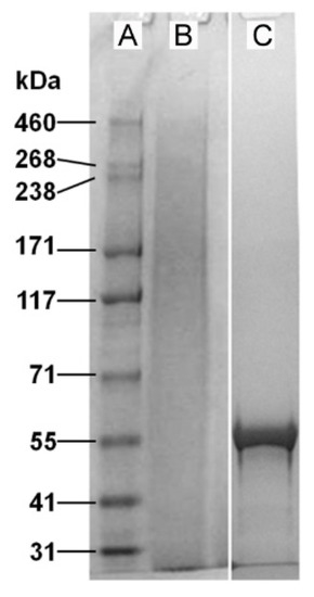 Relative molecular weight distribution for purified native Bombyx mori silk fibroin (B) and recombinant human tropoelastin (C), as displayed by gel electrophoresis. While the extracted fibroin proteins present as a broad range of peptide fragments, recombinant human tropoelastin has a defined molecular weight of approximately 55 kDa. The left lane (A) shows a selection of molecular weight markers.
