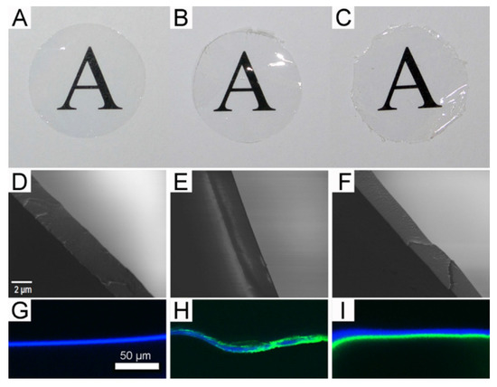 Physical appearance of membranes prepared from either fibroin alone (A, D, and G), tropoelastin-fibroin blend (10:90 ratio) (B, E, and H), and layered solutions of fibroin and tropoelastin (C, F, and I); (A–C): gross appearance of each membrane when placed over printed text (16-mm diameter discs); (D–F): internal structures revealed by scanning electron microscopy following freeze-fracture; and (G–I) visualization of tropoelastin (green) by immunolabelling and confocal fluorescence microscopy (the presence of fibroin revealed as blue autofluorescence).