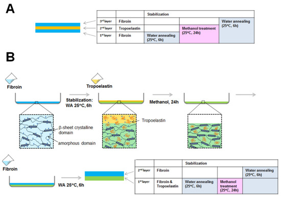 Schematic scenario of the predicted (A) and actual (B) outcomes achieved during the creation of a layered membrane of fibroin and tropoelastin. Based upon FTIR-ATR data, we propose that the bulk of applied tropoelastin is absorbed and subsequently trapped within the initially created fibroin membrane. Therefore, only two main layers are detected by immunofluorescence/microscopy.