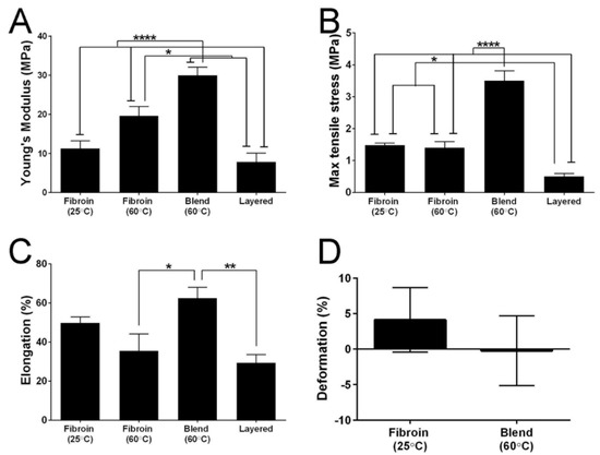 Quantitative comparison of the tensile properties of biomaterial membranes. (A) Young’s modulus; (B) maximum tensile strength; (C) elongation to break; and (D) deformation/recoil capacity after 200 cycles. Bars represent mean values ± standard error of the mean. Asterisks indicate differences are statistically significant (* p < 0.05, ** p < 0.01, **** p < 0.0001).