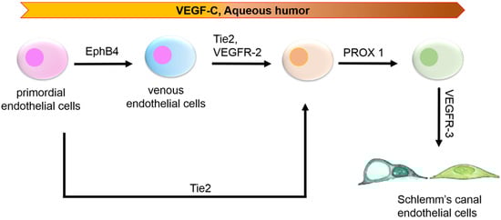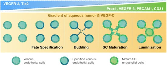The SC development may be classified into four stages, SC progenitor cell-fate specification, lateral sprouting, lumenization, and separation from venous vasculature. Unlike lymphatic progenitor cell-fate specification, the key regulatory molecules and specific markers needed to mediate SC progenitor cell-fate specification have not been clearly identified. Aspelund et al. demonstrated that vascular endothelial growth factor (VEGF)-C is necessary to initiate migration of VECs and lateral sprouting from the transscleral veins. Park and Aspelund and their respective coworkers elegantly demonstrated that SC progenitor cells are VECs that are positive for vascular endothelial growth factor receptor (VEGFR) 2 and the tunica interna endothelial cell kinase (TIE) 2. These SC progenitor cells subsequently acquired PROX1 expression for lumenization and VEGFR-3 for subsequent maturation into SC cells [,] (Figure 2). Truong et al. were the first to demonstrate high expression of the lymphatic transcription factor, PROX1, in SC endothelium, suggesting a closer similarity between SC endothelium and lymphatic endothelium []. Both aqueous humor and VEGF-C are required for proper SC development. VEGF-C (VEGFc+/LacZ) heterozygous mice exhibited delayed budding of SC endothelial cells from the venous system and retarded tubular fusion [,]. Meanwhile, reduction of aqueous humor resulted in endothelial-mesenchymal transition and loss of the lymphatic identity []. Thus, the SC in mice is a unique, specialized endothelium of vascular origin that undergoes partial lymphatic reprogramming during postnatal development to acquire a transient lymphatic identity required for maintaining its proper function in aqueous humor homeostasis [,,]. Similar to lymphatic cells, SC cells experience flow from a basal to apical direction. While these studies were conducted in mice, expression of PROX1 by SC endothelial cells in humans, zebrafish, and mice indicates that the lymphatic-like identity of the SC is conserved in vertebrate evolution [], and suggests that similar developmental pathways are likely to occur in humans, albeit prenatally rather than postnatally.