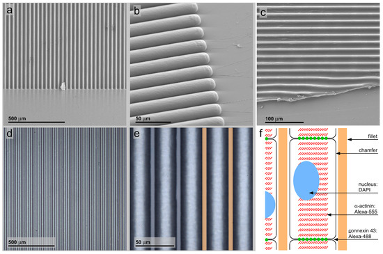Figure 3c represents a higher magnification of the green rectangle with exclusively the α-actinin recording. The protein shows a characteristic cross-striation patterning with the main direction of contraction organized in parallel to the external chamfers’ topography. Cells with disorganized α-actinin were not abundant. Possible explanations for this finding could be the high ratio of cardiac myocytes in the cell preparation or a high vitality over the culture period. In contrast to the bright-field image, cells spanning the fillets can be seen. This difference might be an effect of the higher signal-to-noise ratio of fluorescence recordings as compared to bright-field recordings. Furthermore, the cardiac myocytes spanning the fillets are orientated along the patterns’ length axes and like the cells located inside the chamfers organizing the contractile apparatus along the cell length axis. This indicates that even a closed monolayer favors a geometrical organization in accordance with the external geometry.