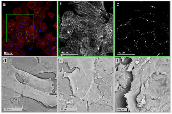 (a) Survey of a group of neonatal murine cardiac myocytes on a smooth glass substrate. The cells are stained for nuclei (blue), gap junctions via connexin-43 immunostaining (green) and the contractile apparatus via α-actinin immuno-staining (red); (b) (insert in (a))Exclusive presentation of the α-actinin signal component; (c) Exclusive presentation of the connexin-43 signal component. Besides the accumulation along pearl chain-like structures located along the intercellular borders, a faint non-specific signal is also visible inside the nuclei due to a cross-over in the acquisition channel. (d)–(f) are SEM recordings of neonatal cardiac myocytes cultivated on plain glass surface. The cells are flat and polygonal with an irregular polygonal shape.