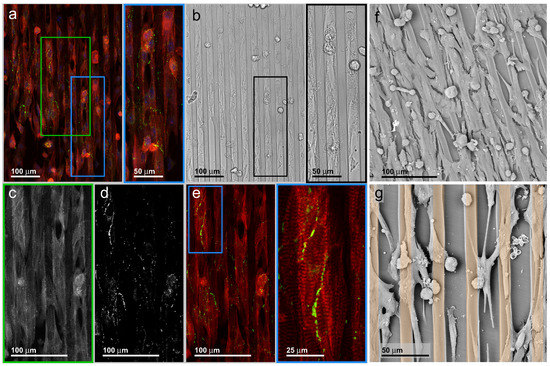 Fluorescence (a) and bright-field (b) light microscopy recordings of a typical murine cardiomyocyte specimen situation. A multicellular ensemble in near-confluent cell density is orientated along the polymer line pattern series; (a,c) (red and green inserts) Dual color overlay of the intracellular α-actinin (red) distribution and the intercellular connexin-43 distribution (green). The red signal closely follows the cell shapes, indicating that all cells are densely filled with α-actinin. Image (c) represents a higher magnification of the green rectangle with the α-actinin recording; (d,e) (blue insert) Distribution of the gap junction protein connexin-43. The pearl chain-like accumulations are located at the cell interfaces inside the cell contacts. A more homogeneous distribution of small signals all over the cytosol indicates non-recruited protein; (f,g) SEM recording of murine cardiac myocytes cultivated on line-patterned substrate. Vital cells are orientated along the fillets, while a randomly-distributed residual of rounded cells indicates the loss of cells during preparation from heart tissue; (f) Near confluent inoculation does not impede the organizing influence of line patterns, but it reduces the ratio of long cell protrusions. Such protrusions are more apparent at low cell densities (g). The golden overlay in (g) hints at the chamfer component of the surface pattern. An abstract sketch of the alternating chamfer to line pattern is given in Figure 1.