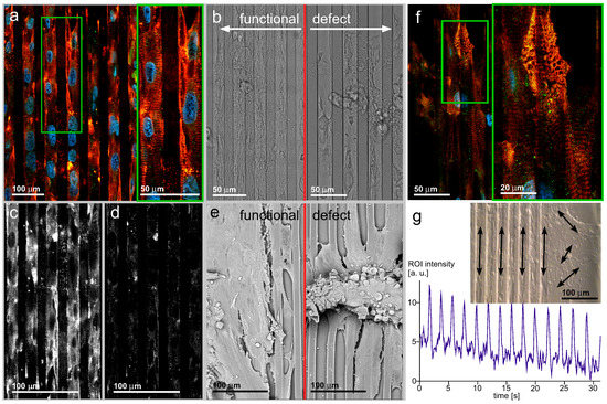 (a,b) (left) The long-term culture of hIPSC-derived cardiac myocytes yields cell assemblies similar to the culture of mouse primary cardiac myocytes, giving rise to the assumption that such stem cell populations can be used to substitute for primary animal-derived specimens; (c,d) Different from the well-ordered α-actinin apparatus, the connexin-43 distribution does not recapitulate the cell interface accumulation as seen in neonatal cardiac myocyte culture; (e) Functional (left) and defect (right) cell ensembles imaged by SEM. The obvious finding that the well-spread cell ensemble is a functional one while the defect one releases surface contacts and reaches a bulk appearance does not absolutely correlate with a loss of contractility. A loss of surface-mediated organization can be regarded inside the bulk assembly. Consequently, spatially-random contracting bulks can be observed; (f,b) (right) Aging effects of the contractile apparatus after long-term cultivation. The regular α-actinin organization with a ladder appearance with pronounced orientation along cells’ longitudes is substituted by a random orientation; (g) Ensembles of cardiac myocytes beat synchronously, indicating electrical excitation coupling. While the direction of contraction is random on a plain surface (right), the line pattern-induced cell ensemble organization results in temporally synchronized and spatially-organized contractions. This fulfills a fundamental prerequisite of cardiac tissue function.