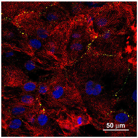 To explore the cardiac contractile apparatus, α-actinin staining can be used. The α-actinin composition and distribution correlates well with the regular contraction activity and also with the maturation state of cardiac myocytes [29]. During the derivation of cardiac myocytes from hIPSC cells and a subsequent maturation process over several weeks, the contractions synchronize. The contraction amplitude increases, while the contraction cycle length variation decreases [30,31]. This makes the α-actinin a good marker for the contractile maturation status of hIPSC-derived cardiac myocytes. In murine neonatal cardiac myocytes, α-actinin is reported to be almost fully developed and, thus, can be compared to that in hIPSC-derived cardiac myocytes [32].