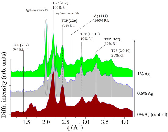 For the CPC-Ag 0.6 wt % cement, CaAg(PO3)3 peaks cannot be distinguished at q = 1.64 (Å−1) and q = 2.3 (Å−1) positions (see Figure 4), likely because the Ag amount is less (0.6 wt % compared to 1.0 wt %), and the background intensity is high. Despite of this, CaAg(PO3)3 presence also in the CPC-Ag 0.6 wt % cement could be indirectly testified by the presence of the Ag Kα and Kβ fluorescence peaks. It is important to stress here that Ag (met.) peaks are not present in the spectra of cement systems, but only in those of the powders.
