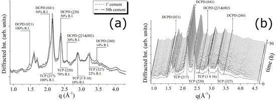 In Figure 2b, a 3D perspective of a sequence of spectra collected during 50 h of hardening process is reported. As can be observed, some differences are present. Indeed, new reflections appeared, while the existing peaks increased their intensities. After an accurate attribution, the new phase was identified as dicalcium phosphate dihydrate, DCPD (Brushite, CaHPO4·2H2O). New reflections, labelled as DCPD (021) (100% R.I.), (041) (75% R.I.) and (221 & 022) (30% R.I.) (card number 09-0077 [17]), testify the partial conversion of the β-TCP phase into the DCPD. In particular, an increase of the β-TCP (220) peak intensity was registered (see Figure 2), whereas other β-TCP (220) and β-TCP (327) peak intensities can be considered unchanged or even slightly decreased. Since not all the peaks, attributed to the β-TCP phase, behaved in a similar way, the registered changes cannot be ascribed to the β-TCP crystallization, but rather to the appearance of the new DCPD phase, DCPD (220) reflection sharing the same q-position with the β-TCP (220) peak.