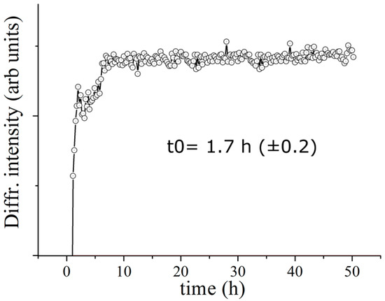 In order to estimate the characteristic transformation time of the evolving system, a quantitative analysis was performed for the DCPD (041) Bragg reflection, as representative for the DCPD phase. A Gaussian fit procedure was carried out upon each collected pattern. The plot of diffracted intensity of the DCPD (041) Bragg’s reflections as a function of time is reported in Figure 3. Each point corresponds to the intensity of the Gaussian fit of the relative peak in the EDXRD spectrum. As can be seen the intensity ranges from an initial values very close to 0 up to the maximum values, defining a plateau region. Time evolution profile of the diffracted intensity shows a typical sigmoidal growth. Performing a sigmoidal fit, the characteristic time of the β-TCP transformation into DCPD was estimated to be 1.7 h.