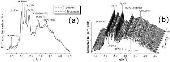 (a) Comparison between the first (after 1 min) and the last (after 50 h) diffraction pattern obtained upon CPC-Ag 0 wt % (control) cement; (b) 3D map of diffraction patterns collected to follow CPC-Ag 0 wt % (control) cement hardening process.