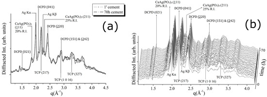 (a) Comparison between the first (after 1 min) and the last (after 70 h) diffraction pattern obtained upon CPC-Ag 1.0 wt % cement; (b) 3D map of diffraction patterns collected to follow CPC-Ag 1.0 wt % cement hardening process.