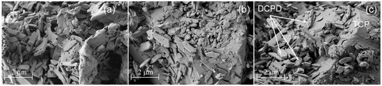 SEM images of (a) CPC-Ag 0 wt %; (b) CPC-Ag 0.6 wt % and (c) CPC-Ag 1.0 wt % cements after 24 h of hardening.