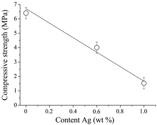 The compressive strength of DCPD cements is known to be limited [1,22]. This is confirmed by the results of the compressive strength measurements performed in this work (Figure 7). The CPC-Ag 0 wt % cement exhibited a compressive strength of 6.5 ± 1.0 MPa, whereas upon doping with Ag, the mechanical characteristics change, revealing the reduced compressive strength of 4.0 ± 1.0 MPa and 1.5 ± 1.0 MPa for the CPC-Ag 0.6 wt % and CPC-Ag 1.0 wt % cements, respectively. It is reported in [23] that the introduction of Ag+ resulted in the increase of cement compressive strengths by approximately 30%, which is not in agreement with the present work, where the opposite effect, i.e., the decreased compressive strength, was registered. In general, the strength of cement systems is strongly governed by phase composition. In our case, the strength properties are largely reduced with the increase of Ag content likely due to the formation of divalent calcium-silver polyphosphate in the final product of CPC-Ag 0.6 wt % and CPC-Ag 1.0 wt % cements.